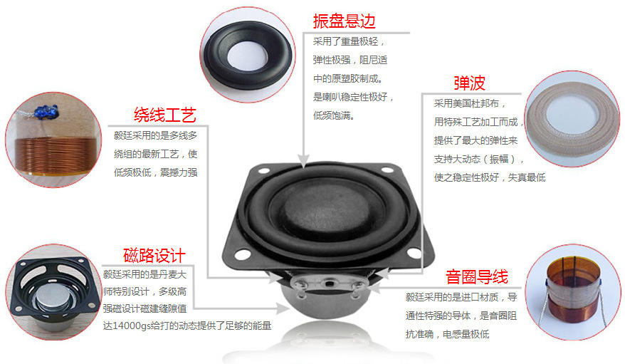 1、振盤懸邊:采用了重量極輕,彈性極強(qiáng),阻尼適中的原塑膠制成。使喇叭穩(wěn)定性好,低頻飽滿。