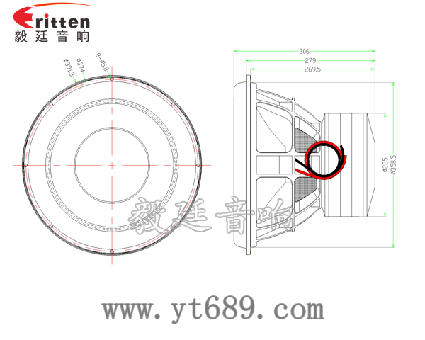 15寸圓形鑄鋁盆架重低音喇叭,采用了超大的磁體Φ225X25mm磁性強(qiáng),給喇叭提供了飽滿的動(dòng)力;