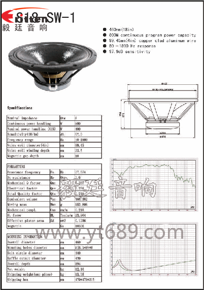 東莞市毅廷音響科技有限公司嚴格貫徹,質量讓您放心,服務讓您舒心,價格讓您動心,這款舞臺音箱喇叭,音域28Hz~3KHz,18寸100芯400瓦重低音喇叭。